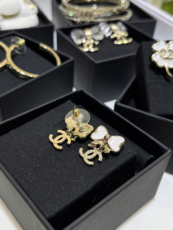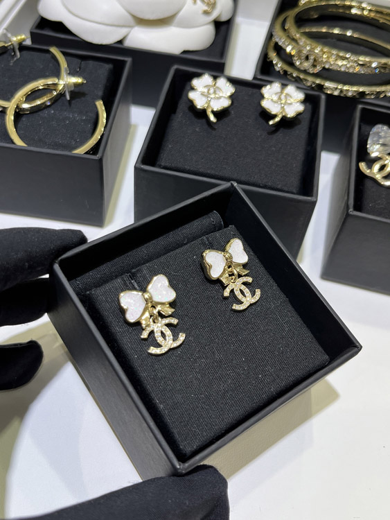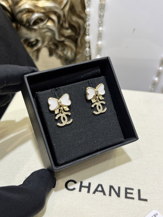 Chanel white glitter enamel bow gold full diamond double C earrings-3745