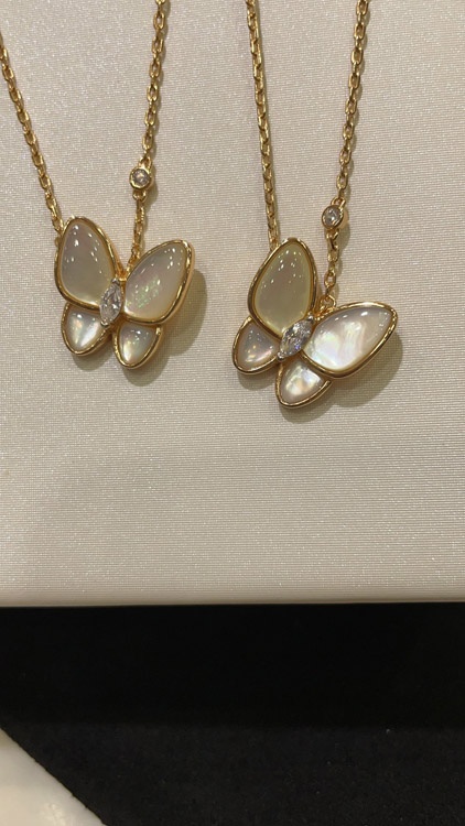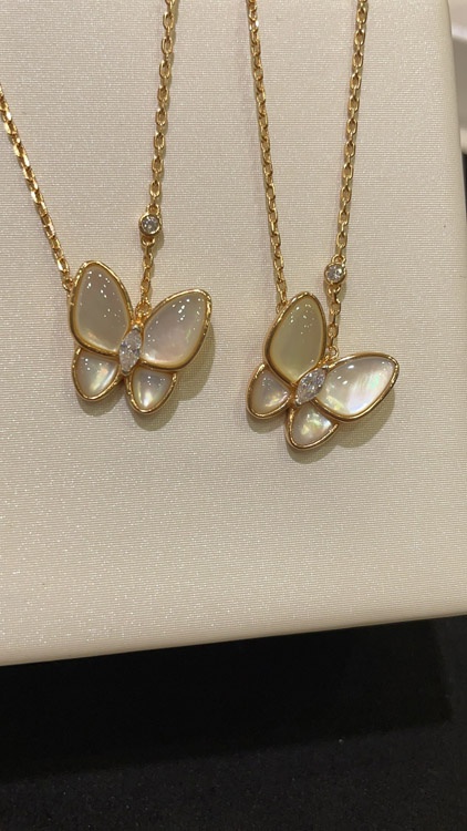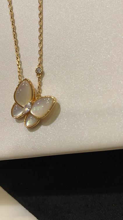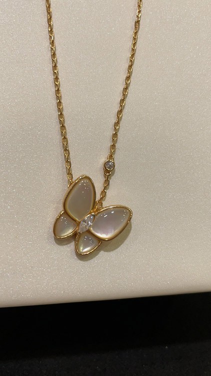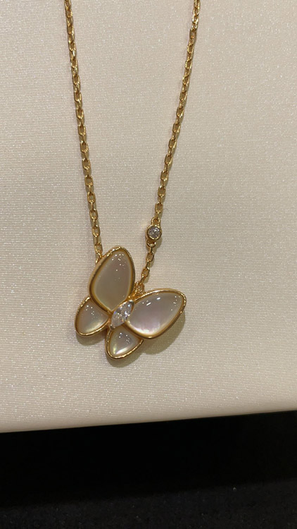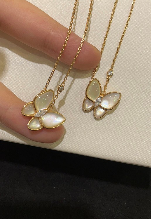 Van Cleef & Arpels White Mother-of-Pearl Diamond Floral Butterfly Necklace-3733